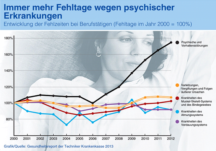 „66 Prozent der Beschäftigten, die mit ihrem Unternehmen unzufrieden sind, gaben an, physische Beschwerden zu haben. Bei denen, die von einer guten Unternehmenskultur berichteten, waren es nur 32 Prozent. Bei psychischen Beschwerden fielen die Ergebnisse ähnlich aus. Von allen Fehltagen geht jeder zehnte auf eine psychische Erkrankung zurück. Beschäftigte, die wegen Depressionen oder Erschöpfung krankgeschrieben sind, brauchen außerdem besonders lange ehe sie wieder arbeitsfähig sind.“ (frei nach Fehlzeitenreport der AOK 2015)